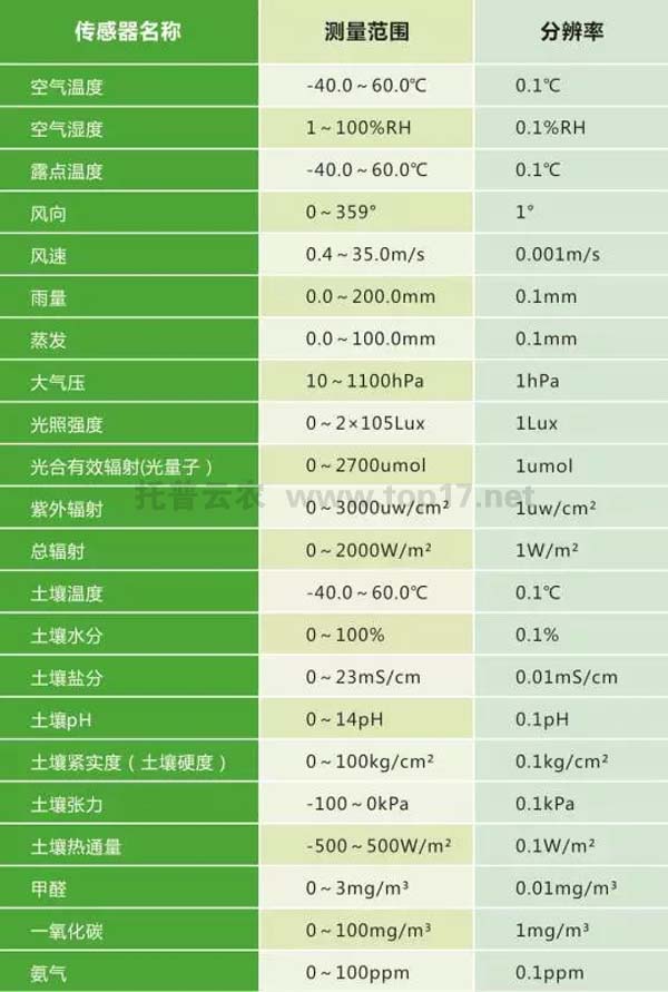 在農業氣象方面,目前有空氣溫度、濕度、光照強度、光合有效輻射、二氧化碳、雨量、蒸發、風速風向、大氣壓、總輻射、紫外輻射等傳感器。同時,還有應用于畜禽養殖監測的氨氣、硫化氫等傳感器,應用于水質監測的pH、余氯、濁度、溶解氧、氨氮、水溫等傳感器,應用于環境監測的一氧化碳、二氧化碳、甲醛、PM2.5、PM10等傳感器。