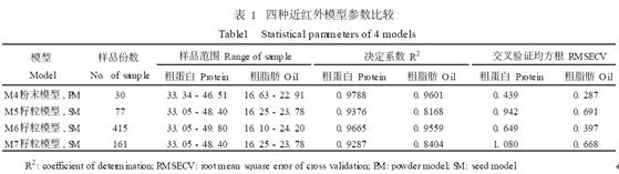 采用4個建模樣品集,由權威檢測中心(以M2表示)依照GB290521982和GB290621982獲得化學值。近紅外檢測采用德國Bruker公司的Matrix2I傅立葉近紅外光譜分析儀,取適量大豆籽粒置于樣品杯中,用透射方式掃描獲得大豆籽粒樣品的近紅外吸收光譜圖,掃描譜區4 000~12 600 cm- 1 ,分辨率16 cm- 1 ,掃描速度10 KHz,掃描次數60次,每個樣品重復裝樣掃描3 次。利用B ruker 公司的OPUS412軟件的Quant 2 方法, 以偏最小二乘法( PLS)建立大豆粉末、籽粒近紅外檢測粗蛋白及粗脂肪含量的模型,使用交叉檢驗法對模型做出評價。