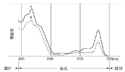 從圖中可以看出,葉綠素在藍色區域(400—500nm)和紅色區域(600—700nm)范圍內吸收達到了峰值,但在近紅外區域卻沒有吸收。也就是說,不同波長的光線,葉綠素的吸收量是不同的。這也正好符合了我們的要求,通過不同的吸收量,來測出spad值。