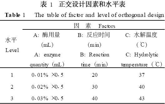 從表3中直觀分析(極差分析) 即R值的大小可以看出, 在試驗所選因素的水平范圍內, 各因素對水解程度的影響大小順序為: 水解溫度>酶用量>反應時間; 試驗最佳條件為C1A2B1 , 即水解溫度37℃, 酶用量0102% , 反應時間20 min。