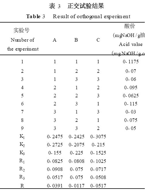 本實驗以10 mL色拉油為底物,以酶用量、水解溫度、反應時間為因素,通過酸價的測定選定其水解的最佳條件。正交實驗設計見表1和表2。