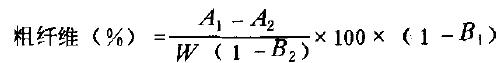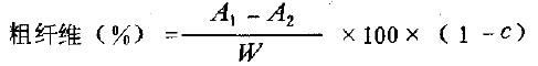 樣品相繼與熱的稀酸、稀堿共煮,并分別經(jīng)過(guò)濾分離、洗滌殘留物等操作,再進(jìn)行干燥、灰化。酸可將糖、淀粉、果膠質(zhì)和部分半纖維素水解而除去。堿能溶解蛋白質(zhì)、部分半纖維素、木質(zhì)素和皂化脂肪酸而將其除去。再用乙醇和乙醚處理。所得的殘?jiān)稍锖鬁p去灰分重即為粗纖維含量。