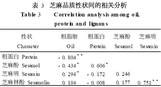 各品質性狀間的相關系數列于表3。粗脂肪與粗蛋白質含量呈極顯著負相關,與過去的大量分析和報道結果一致,與芝麻明含量呈顯著正相關。芝麻明與芝麻林酚含量呈極顯著正相關,粗蛋白含量與芝麻酚含量呈顯著正相關。在芝麻品質育種選擇時需注意協調這些性狀之間存在的關系。