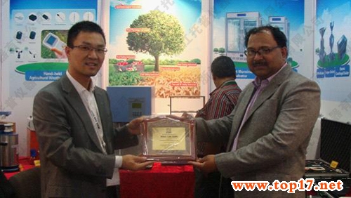 圖為:印度領(lǐng)導(dǎo)為托普儀器陳渝陽總經(jīng)理頒發(fā)獎項