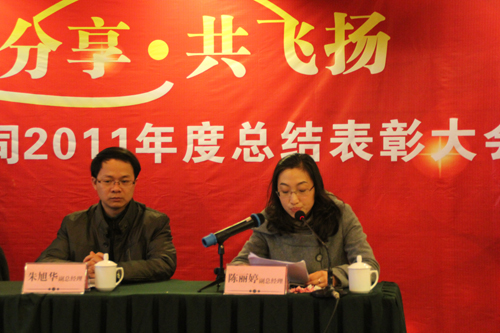 浙江托普儀器有限公司2011年年度總結表彰大會于2012年1月15日在銘泰大酒店七樓會議室圓滿召開。此次會議的主題是“同創造 齊分享 共飛揚”,托普上下110余人齊聚一堂,共同回顧2011年托普儀器的點點滴滴,并對2012年各項工作進行展望。
