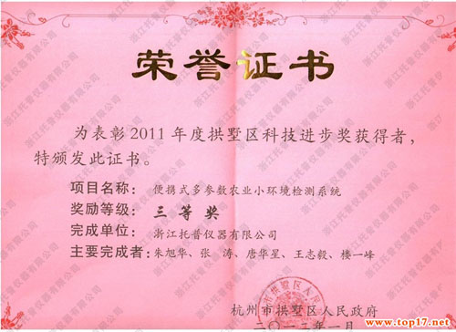 托普儀器研發的便攜式多參數農業小環境監測系統獲得全面成功,同時該項目也喜獲2011年度浙江省杭州市拱墅區科技進步三等獎。