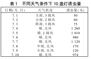 在昆蟲羽化盛期7月選擇1~10日的統計結果表明(表1),無風、晴天誘蟲數量明顯高于陰雨多風的天氣,特別是雨天誘蟲量很少,因而雨天不宜開燈。