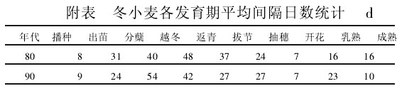 通常以每年第一次5日平均氣溫<0e的最后一天定為越冬開(kāi)始期;或冬季氣溫常年在0e左右擺動(dòng)的地區(qū),以小麥植株高度變化而定。通過(guò)對(duì)駐馬店市歷年逐日平均氣溫統(tǒng)計(jì)分析發(fā)現(xiàn):20世紀(jì)80年代以前,12月下旬至2月的大部分間里5日平均氣溫都在0e以下或在0e左右擺動(dòng)。90年代以后,氣溫已發(fā)生明顯變化,12月及2月下旬5日平均氣溫<0e日數(shù)基本消除,1月~2月中旬也只有在個(gè)別年份的個(gè)別時(shí)段內(nèi)5日平均氣溫<0e,其它時(shí)段都在0e以上;從生長(zhǎng)高度來(lái)看,越冬期內(nèi),植株并沒(méi)停止生長(zhǎng),而是有微弱的上升。因此近幾年來(lái),在本區(qū)越冬開(kāi)始期已很難確定。根據(jù)作物觀測(cè),20世紀(jì)80年代越冬日期平均在1月2日,90年代以后越冬日期平均在1月8日,越冬期明顯滯后,尤其是2001~2002年度竟無(wú)越冬現(xiàn)象。由附表也可看出,90年代以后分蘗期延長(zhǎng),返青期提前,越冬期相對(duì)縮短。種種跡象表明,隨著氣候的逐漸增暖,本區(qū)冬小麥已沒(méi)有明顯的越冬期。