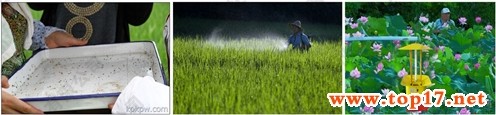 圖為:捉蟲、噴藥、殺蟲燈殺蟲