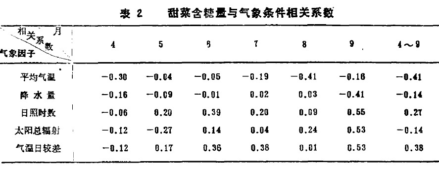 氣候含糖量與4~9月氣溫日較差呈正相關(見表2),相關系數r=38,5,月各月均為正相關,7月達。8~9月達53,具有與日照相關相同的趨勢,因此氣溫百較差也是影響甜菜搪分積累的主要氣象因子之。