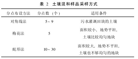 在土壤環(huán)境質(zhì)量監(jiān)測工作中,一般采集混和土樣,即在一個采樣區(qū),把多點(diǎn)采集的土樣混合成一個樣品,一方面可以減少分析量,另一方面可以把采樣區(qū)微量不均勻性的影響減到最低限度。采樣時應(yīng)沿著一定的路線,按照/隨機(jī)0、/等量0和/多點(diǎn)混合0的原則進(jìn)行。在該次土壤調(diào)查中常用的多個采樣點(diǎn)的布設(shè)方法是:對角線采樣法、蛇形采樣法和梅花形采樣法等,其適用條件和采樣的分點(diǎn)數(shù)見表2。