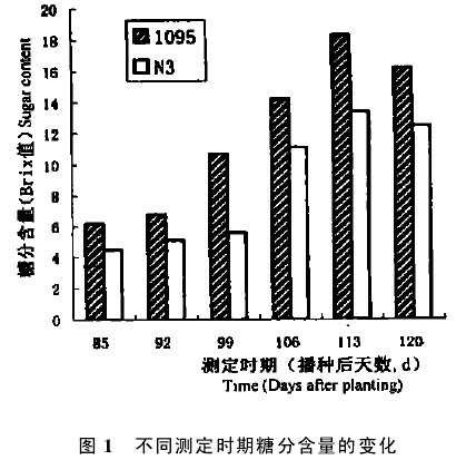 2.2 不同節間糖分含量的變化 就高糖系1095而言,一共7個節間,6個測定時期中的4個時期糖分含量最高值出現在第?節間,2個時期是第?節間的含糖量最高(表1)。就低糖系N3來說,情況與高糖系1095相比,略有不同。親本N3共有6個節間,6個測定時期中的4個時期是第?節間含糖量最高,g個時期(106 d)是第?節間含糖量最高,另一個時期(99 d)是第?節間含糖量最高。據此,作者認為高粱莖稈中糖分含量最高的節間應該是中部節間或上一節間,這將給準確測定高粱莖稈中糖分含量提供理論依據。