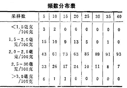 因為平均是2.345毫克/百克土,可以認(rèn)為在2.0一2.5毫克/百克土間近似平均值范圍,在此范圍內(nèi)出現(xiàn)頻數(shù)越多,其采樣伐表性越好。假設(shè),每次只采五點混合樣品進(jìn)行分析,在一百次中,僅有43次可能接近平均值,有9次機會不是高于3.0毫克/百克土,或者低于1.5毫克/百克土。
