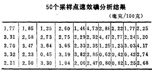 在調(diào)查的耕地上,以等距離方格法,單點采集土壤樣品50個,單獨以相蘭法分析其速效磷,五十點樣品速效磷分析結(jié)果如表2,表2中次序是采樣點的實際位置。50點速效磷分析結(jié)果的均值僅2.349毫克/百克土,極差(R)4.51,方差(52)1.1,不均勻率(CV)0.348。