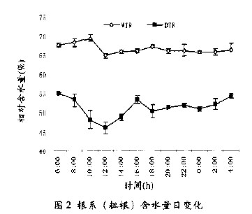 處于不同水分狀態下的根系含水量(主要是粗根)日變化也證明了根系存在提水作用。1天中濕側根系的含水量在64.9%以上,而干側土壤的根系含水量最高只有55.2%,在上午10:00二者相差達34.3%。對應于根系的水勢變化,干濕兩側的根系含水量晝夜變化趨勢與粗根的水勢基本一致(圖2),1天中出現2個含水量高峰,干旱一側根系的第一個高峰含水量出現在凌晨6:00,比濕側提前4h;而第2個含水量高峰出現在下午4:00,比濕側提前2h。二者均在中午12:00出現含水量最低點,說明夜間干旱一側根系有水分進入,當蒸騰開始時含水量開始下降,而濕根側一直處于吸水狀態,隨蒸騰進行吸水能力加強。值得注意的是,當地上部蒸騰降低以后,濕側根系水勢逐步回升,而含水量卻輕微降低,與此同時干旱一側的根系含水量開始上升,說明當氣孔關閉或部分關閉蒸騰速率較低時,有水分運轉到干根一側的根系,而且這些水分并不是自根系從外界吸收的,證明葡萄根系中存在提水作用,含水量高的根系可以把水分運轉到含水量低的一側根系。