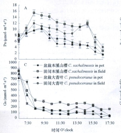 從圖ZA中看出,一天中除早、晚外,田問植株的Pn顯著大于盆栽植株。在早晨,隨著光強和溫度的逐漸增強,田問櫻桃的Pn上升幅度明顯快于盆栽櫻桃。下'I幾1-30左右田問櫻桃的Pn出現第2次高峰,但盆栽植株的Pn于上,i幾9.30以后便持續(xù)下降。經計算,田問本溪山櫻、盆栽本溪山櫻、Hi問大青葉及盆栽大青葉的日累計光合產物(同化COZ總量)分別為459.2n263.-393.9及284.7mmo1"m,由此可見,田問櫻桃的光合能力遠遠高出盆栽植株。