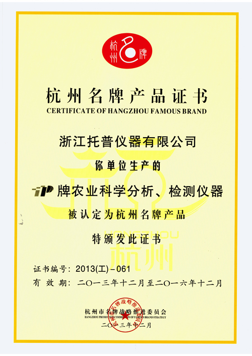 2013年11月26日根據杭州市名牌戰略推進委員會組織綜合評價,共選出115個產品,其中農業產品30個,工業產品62個,服務業產品23個。經過托普人不懈的努力,托普儀器申報的農業科學分析、檢測儀器最終被列為2013年杭州工業產品類的名牌產品。