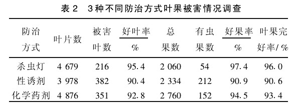 防治效果見表2,從表2中可以看出,呂家村試驗園棗葉果完好率為96%,高于性誘劑與化學防治。由此可見,利用太陽能殺蟲燈防治棗樹害蟲效果明顯,同時兼治了附近農田林網、其他果樹及大田作物的多種害蟲,不僅可控制當年危害,還可大大降低蟲口密度,減輕第2年的危害,同時也減小了其他害蟲的防治難度,降低了生產成本。性誘劑測報及防治雖然高效,但具有專一性;瘜W防治成本高,污染重,對天敵沒有選擇性,不符合生產綠色食品的要求。