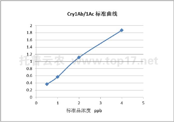 本品系用特異性抗 Cry1Ab/1Ac 單抗包被的微孔板和酶標記抗 Cry1Ab/1Ac 單抗,雙抗體夾心法檢測 Cry1Ab/1Ac 基因表達產物,可以高靈敏度和特異性的檢測轉基因植物中的 Bt-Cry1Ab/1Ac 蛋白。